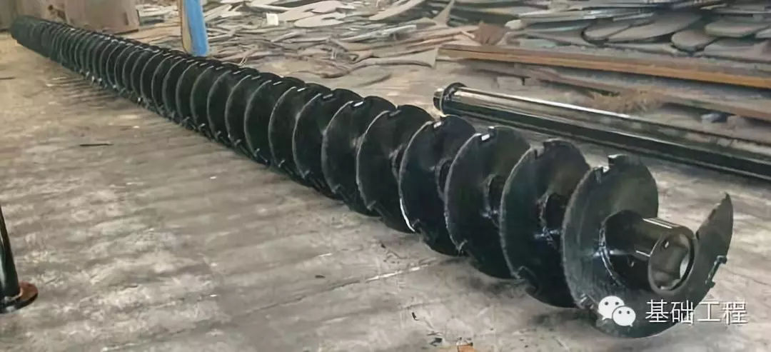 長螺旋鉆具:鉆具為連續長螺旋形式,鉆具有中心管內灌注混凝土的功能,且其頂部設有泄氣閥,。中心管的底部有混凝土出口,出口處有兩片可開閉的活瓣。鉆具開始鉆削土體之前,應將活瓣閉合,以防止土、砂或水進入中心管內,泵輸送混凝土時將活瓣打開。